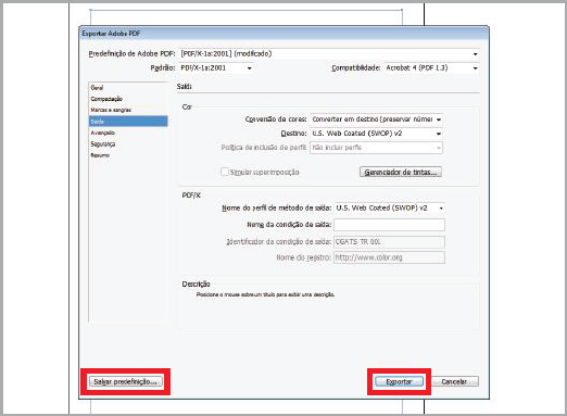 Neste janela, selecione a "Predefinição de Adobe PDF: [PDF-X1a:2001]"