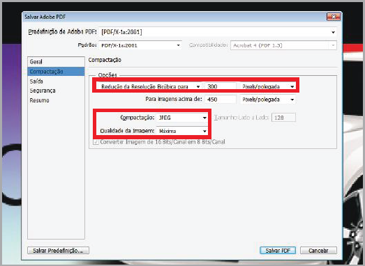 Nesta janela, selecione a "Predefinição de Adobe PDF" para "[PDF/X-1a:2001]"