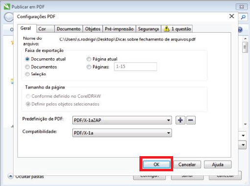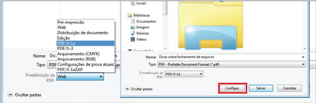 Na próxima janela, vá em "Predefinições de PDF" e selecione "PDF/X-1a" e depois clique em "Configurar"