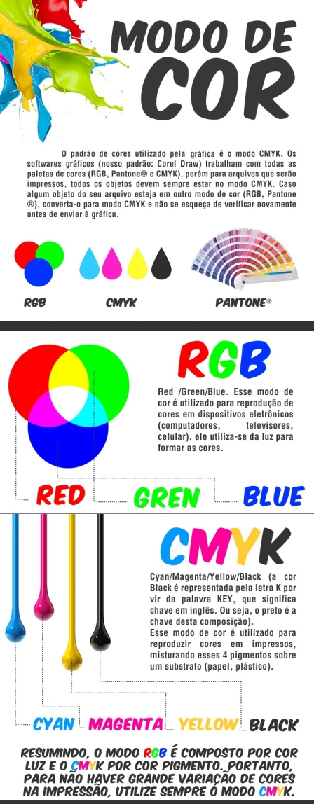 O que significa 1x0 - 4x0 - 4x1 - 4x4 cores? Qual a diferença entre CMYK e RGB e Pantone? Prazo de Entrega e Formas de Envio |